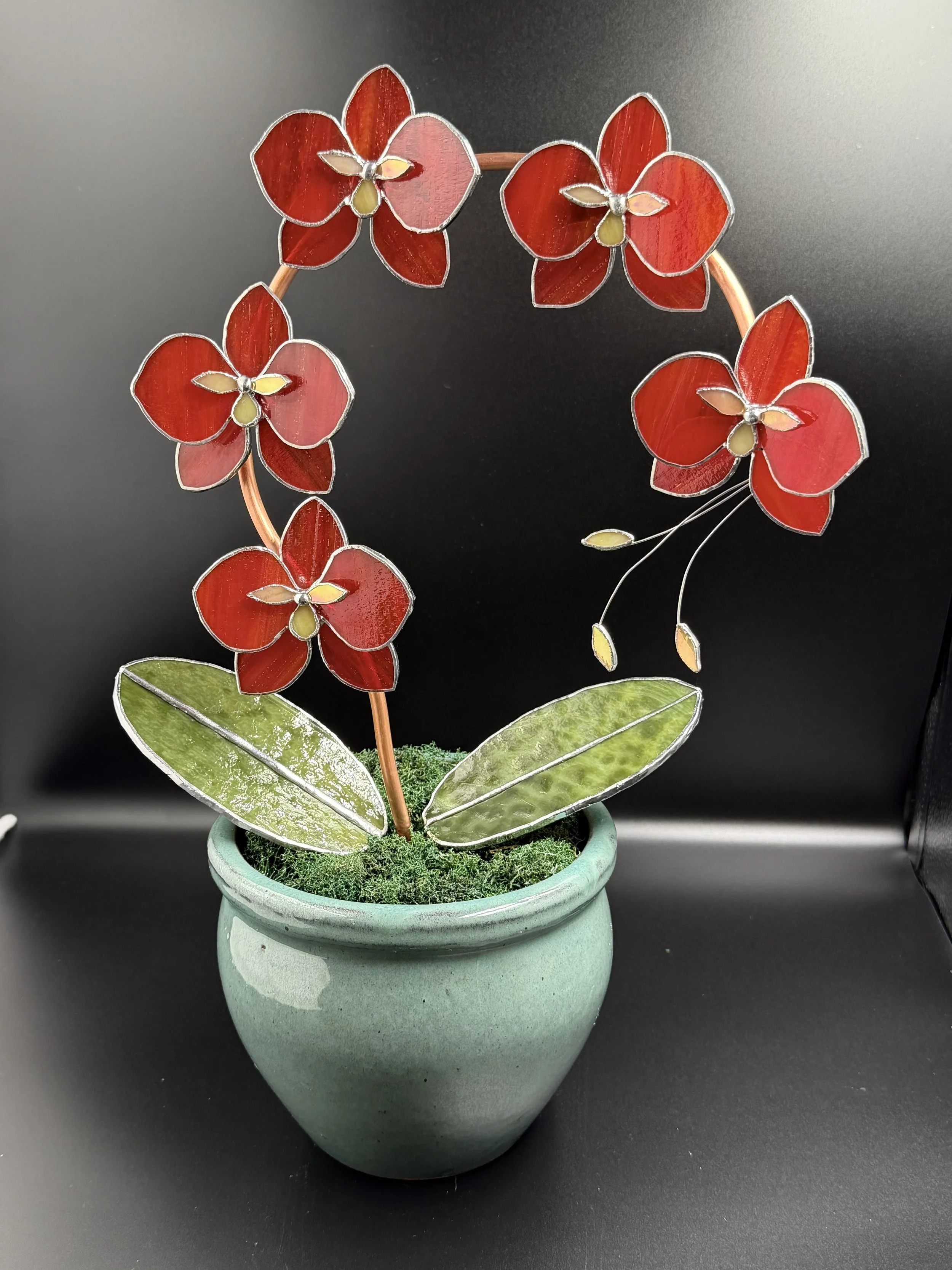 I would love to create something special just for you. Commissions are a truly collaborative experience — you can be as involved as you'd like, from start to finish. Together we'll choose everything that makes your piece uniquely yours: glass colors, textures, and finishes, and if you're ordering a potted orchid, even the pot itself. Or, if you prefer, just share a little about what you're looking for and leave the rest to me.